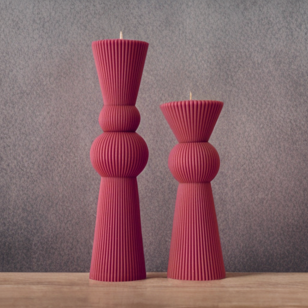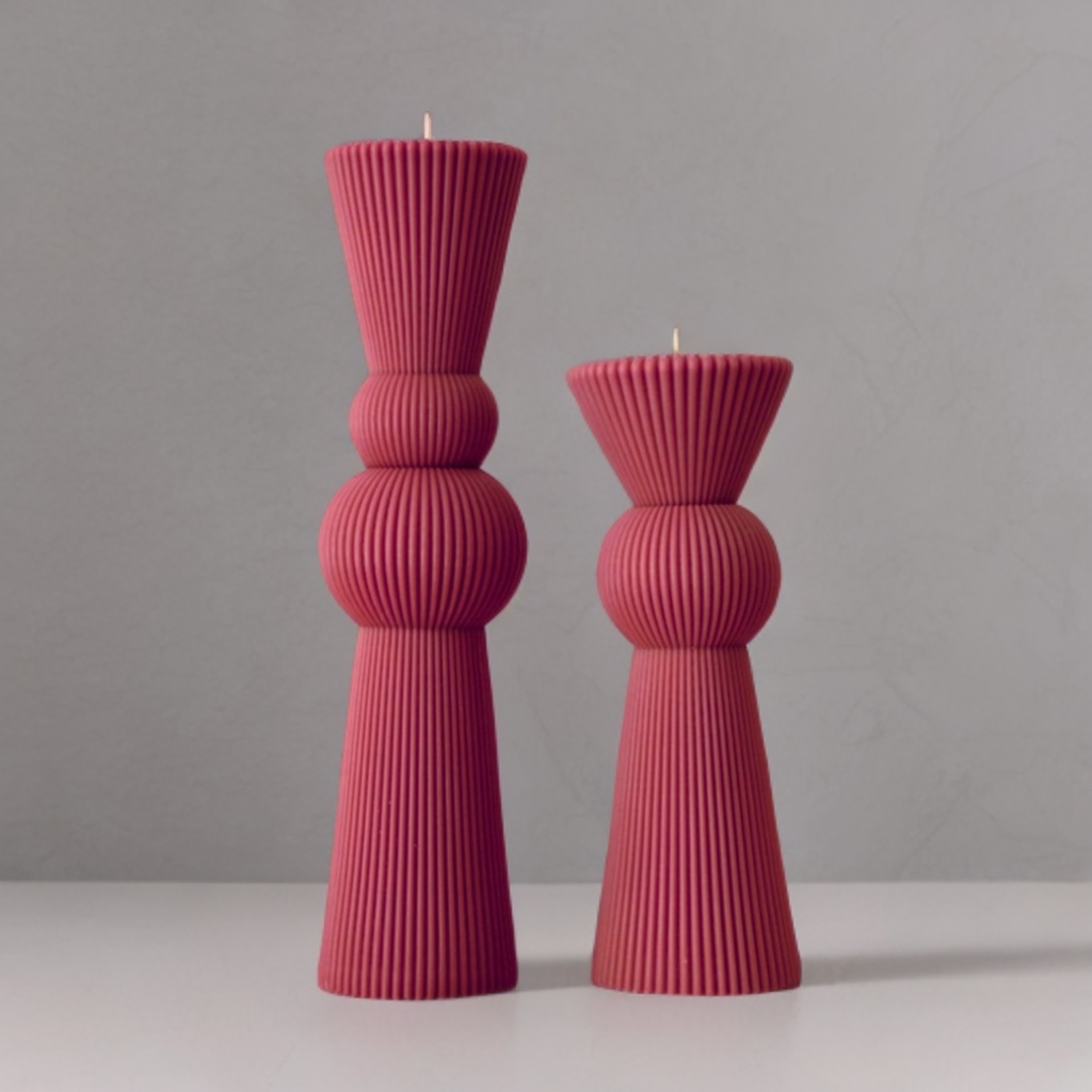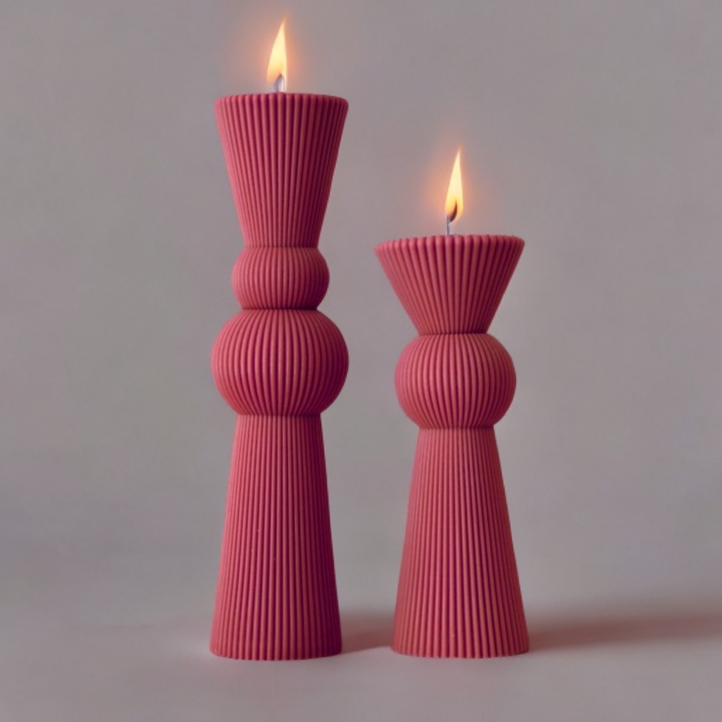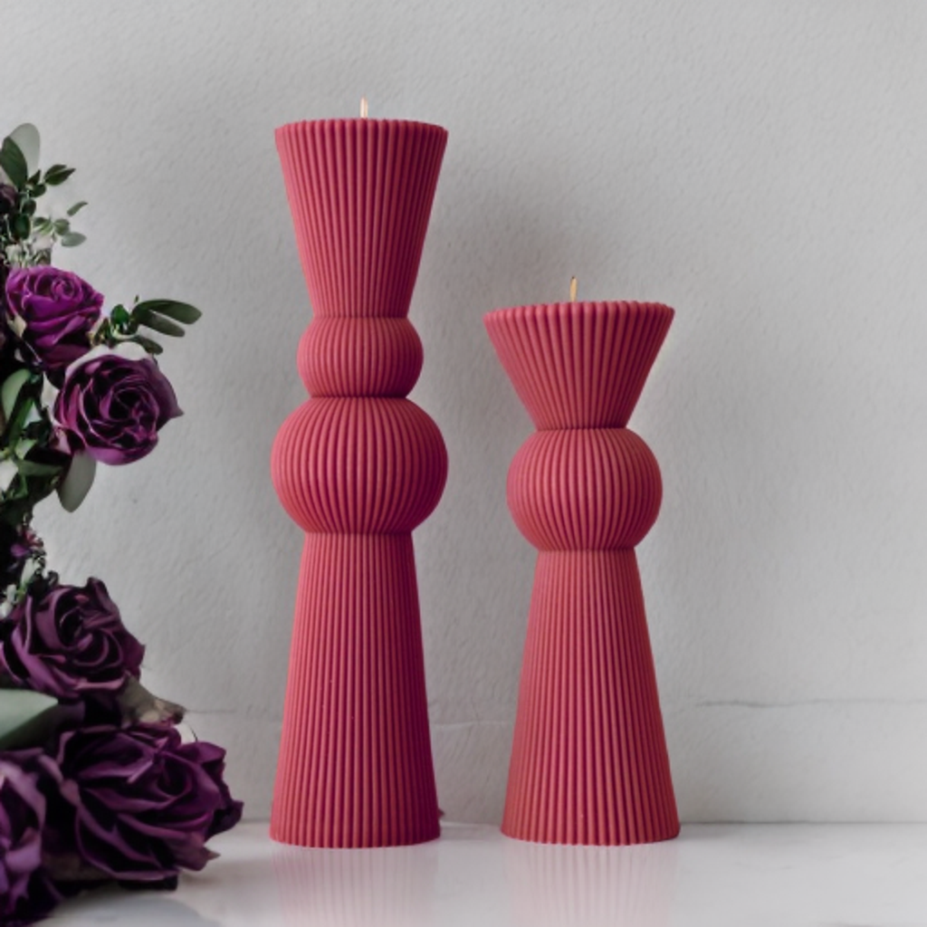 Set lumânări decorative / nuntă / botez, realizate prin turnare în matrițe, discret parfum, culoare magenta.